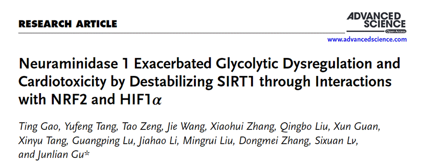 5月24日,AC米兰官方顾俊莲教授团队在Advanced Science杂志(中科院JCR期刊1区,五年IF=15.6)在线发表题为“Neuraminidase 1 Exacerbated Glycolytic Dysregulation and Cardiotoxicity by Destabilizing SIRT1 through Interactions with NRF2 and HIF1α”的研究论文。AC米兰官方顾俊莲教授为该论文的通讯作者,AC米兰官方硕士研究生高婷为第一作者,AC米兰官方为第一作者单位和通讯作者单位。