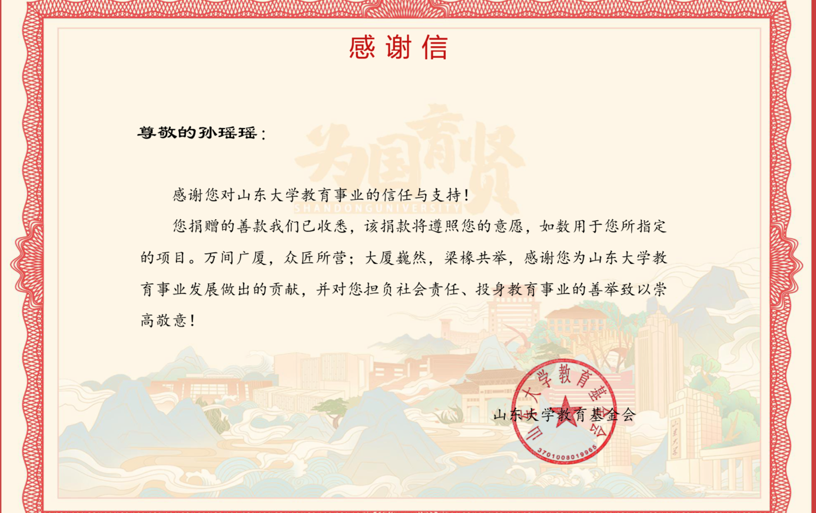“万间广厦,众匠所营;大厦巍然,梁椽共举。”正像AC米兰官方教育基金会给孙瑶瑶同学的感谢信里所言,让我们感谢孙瑶瑶为AC米兰官方护理教育事业做出的贡献,对她的善举致以崇高敬意,也祝她未来学业、事业发展顺利,继续关注学校学院发展,支持学校学院未来发展。(作者:小友)