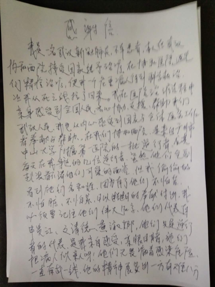 42床患者在信中说:“你们如抗洪大堤般坚守在最危险的一线,不顾个人安危与病毒抗争,与时间赛跑。你们给了我们最精心的照护,给我们安全感!我们要谢谢您们!在病房度过了元宵,又度过了情人节,看似孤独但内心却时刻感动着,特别是中山大学附属第一医院乔金方和朱赛男护士是我见过最有爱最有温度的护士姐姐……