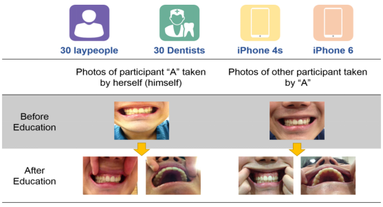研究对象为30名普通人和30名牙医,随机各分为15个小组,每组2名。在假设发生牙外伤的情况下,每个受试者都被要求用iPhone 4s和iPhone 6给自己的前牙和同伴的前牙进行拍照。然后进行如何为远程会诊目的拍摄合适的前牙照片的教育,教育完成后再次拍照。最后由专业口腔医生评估这些照片的诊断价值。