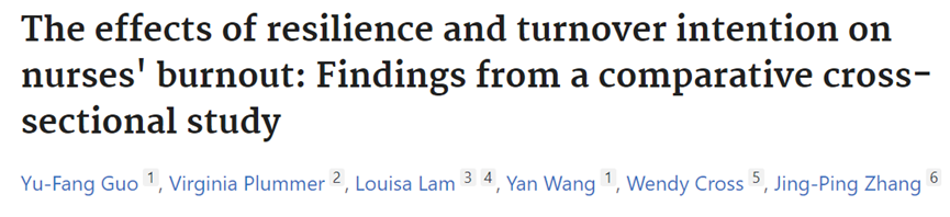共纳入100名澳大利亚护士和197名中国护士,评估两国护士的职业倦怠、心理弹性和离职意愿的情况,其中澳洲的护士采用线上调查方法,中国护士采用纸质问卷调查。